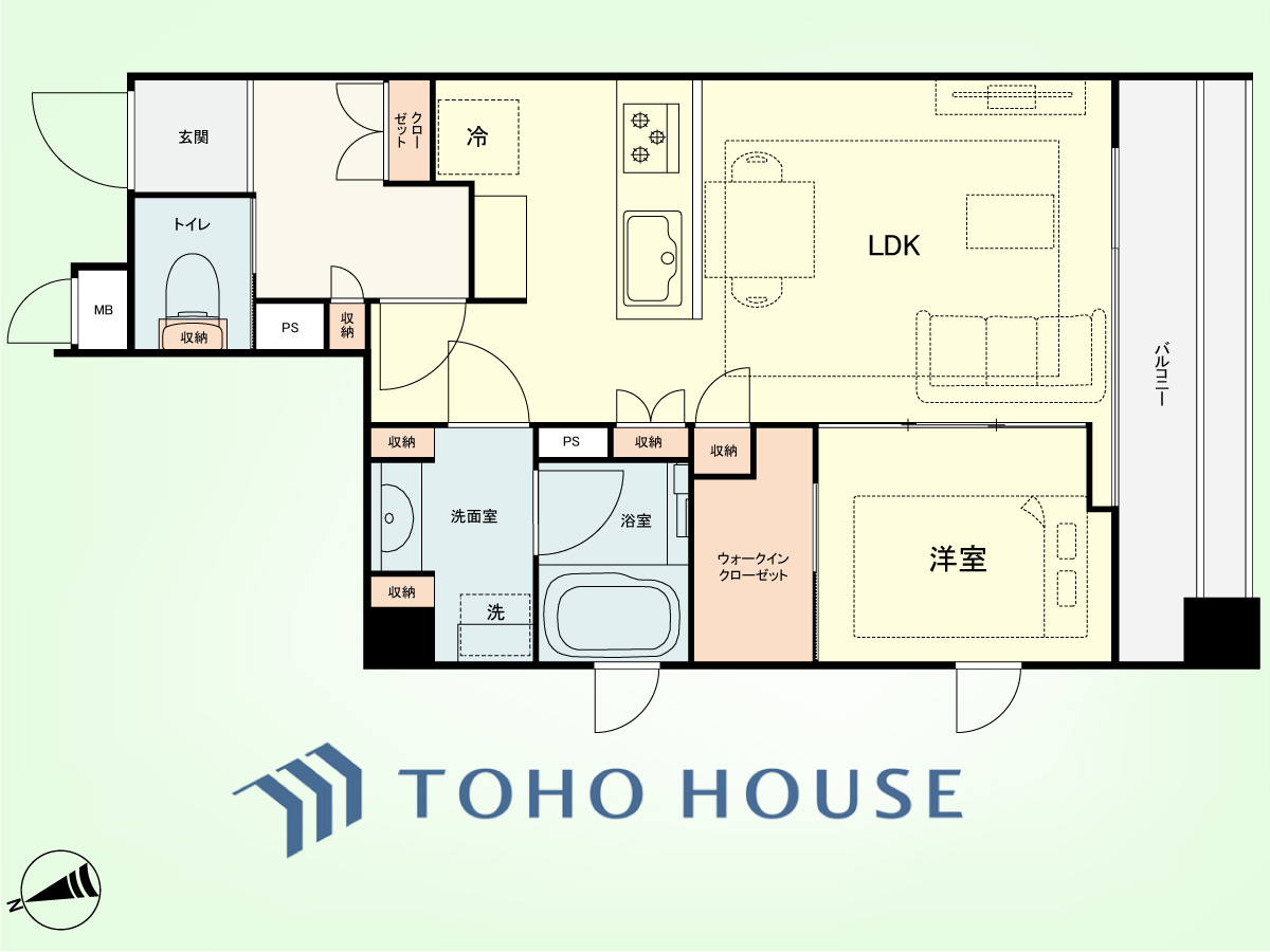 1LDK 専有面積40.66平米、バルコニー面積8.84平米