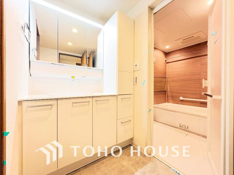白を基調とした清潔感のある洗面室で朝の身支度を