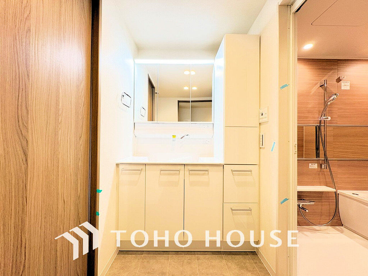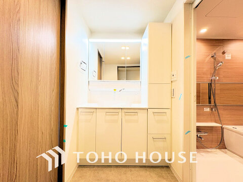 落ち着きのある色合いでまとめられた洗面室