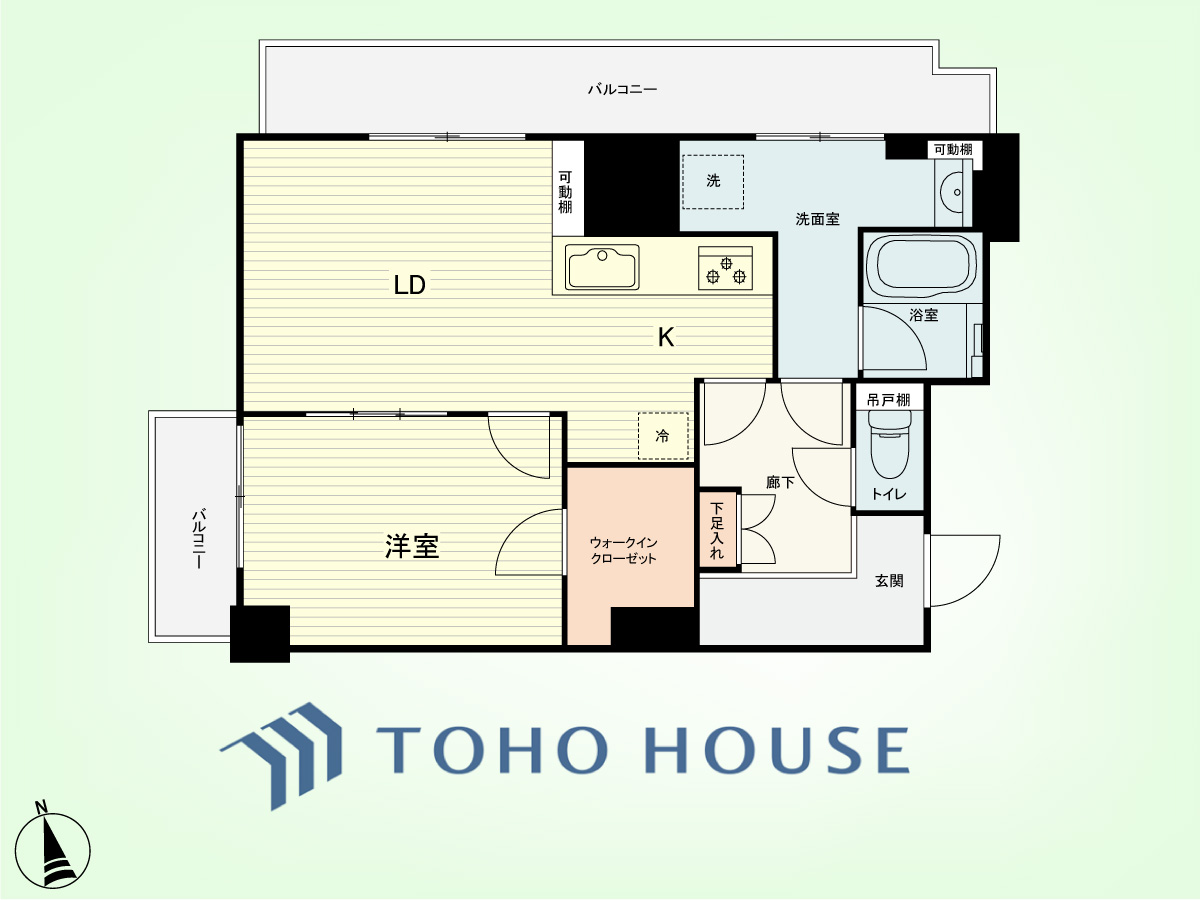 1LDK 専有面積44.66平米、バルコニー面積9.87平米
