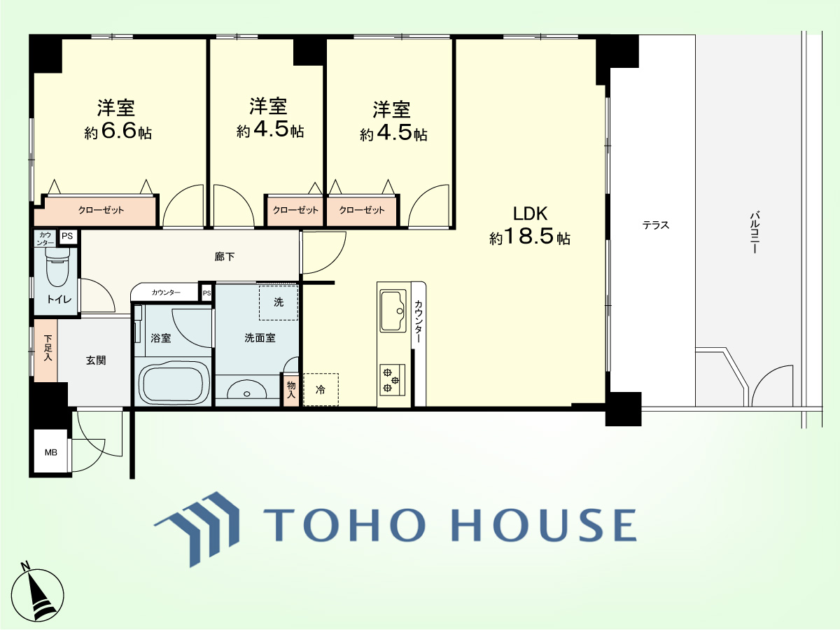 3LDK 専有面積77.84平米、バルコニー面積11.2平米、専用庭面積22.28平米