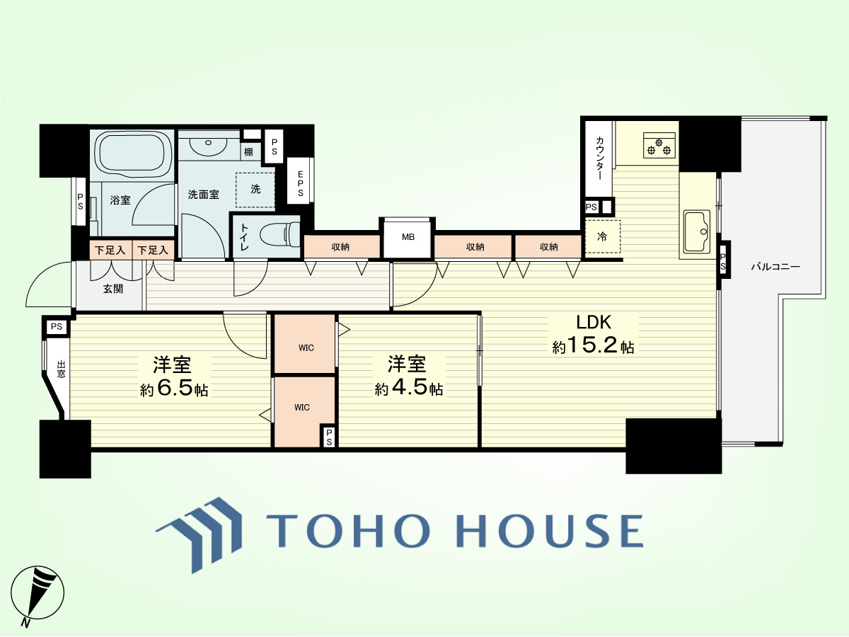 2LDK 専有面積64.43平米、バルコニー面積10.08平米