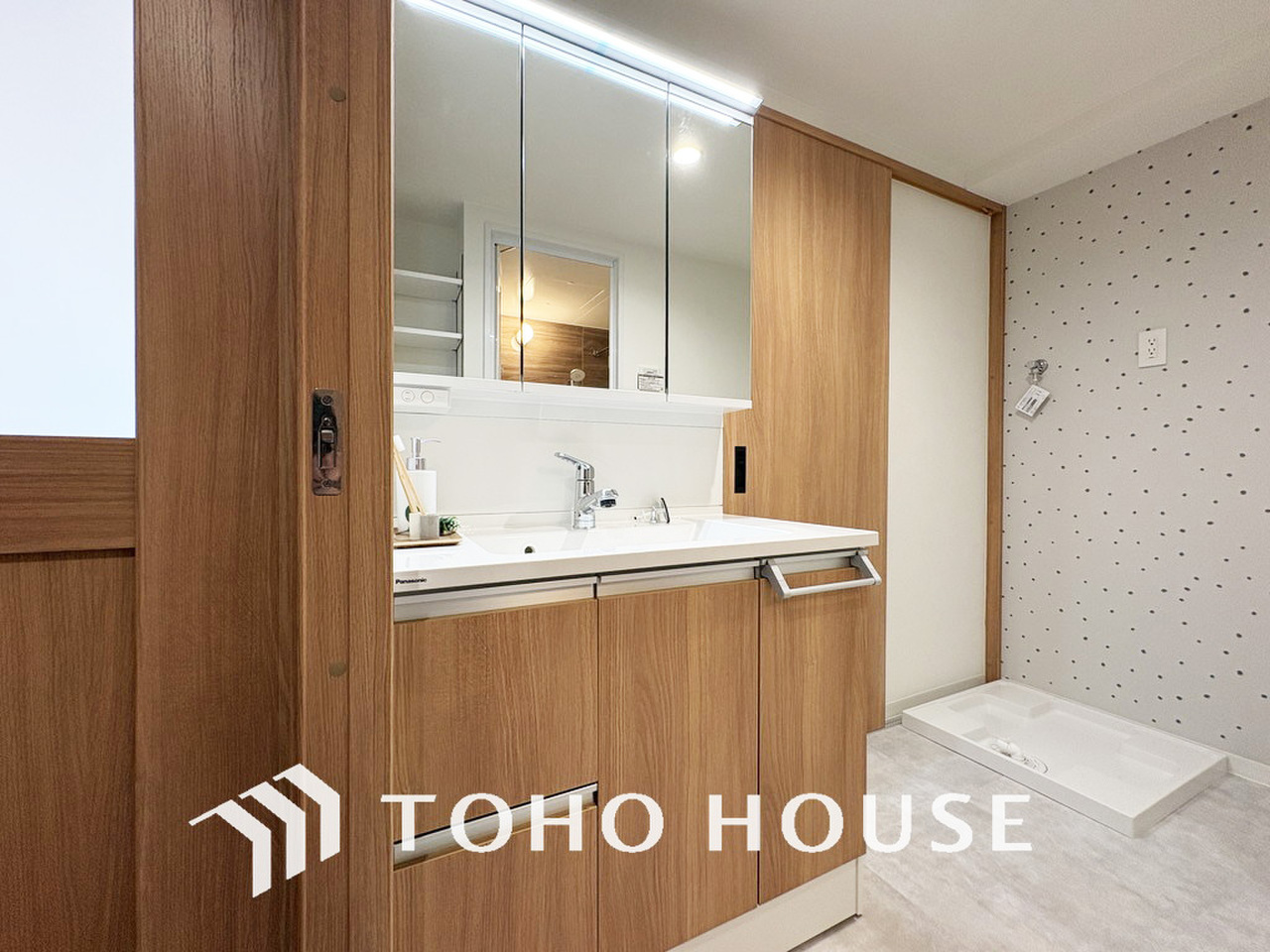 新規設置の洗面化粧台。収納豊富で使い勝手の良い3面鏡です