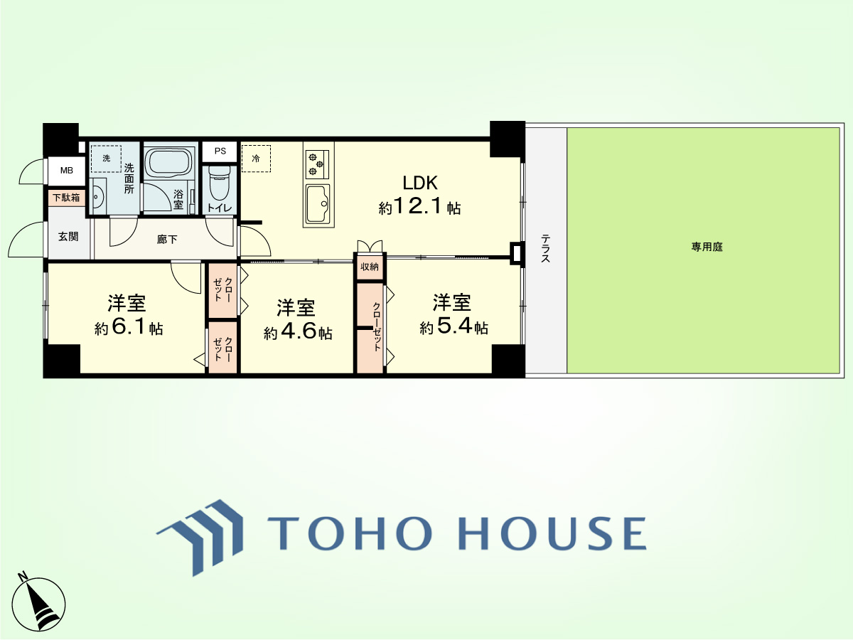 3LDK 専有面積62.72平米、テラス面積5.6平米、専用庭面積38.03平米