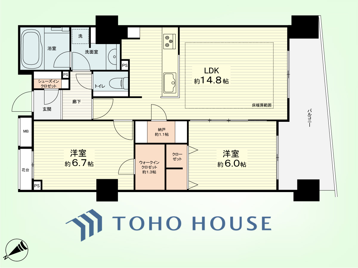 2LDK+納戸 専有面積63.79平米、バルコニー面積10.98平米
