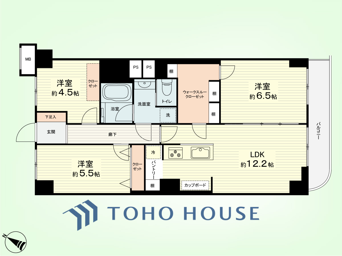 3LDK+パントリー 専有面積66.95平米、バルコニー面積5.54平米