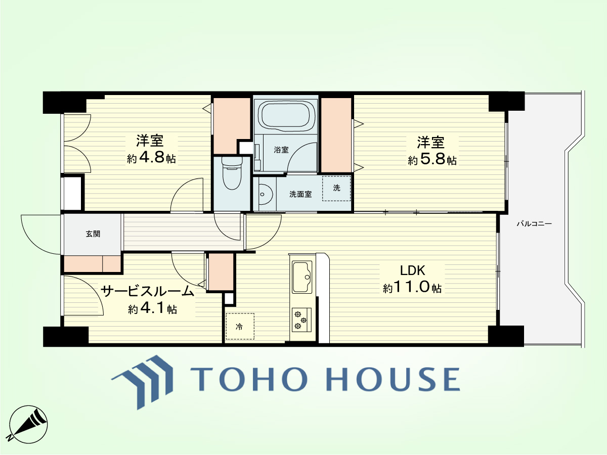 2SLDK 専有面積56.99平米、バルコニー面積8.87平米
