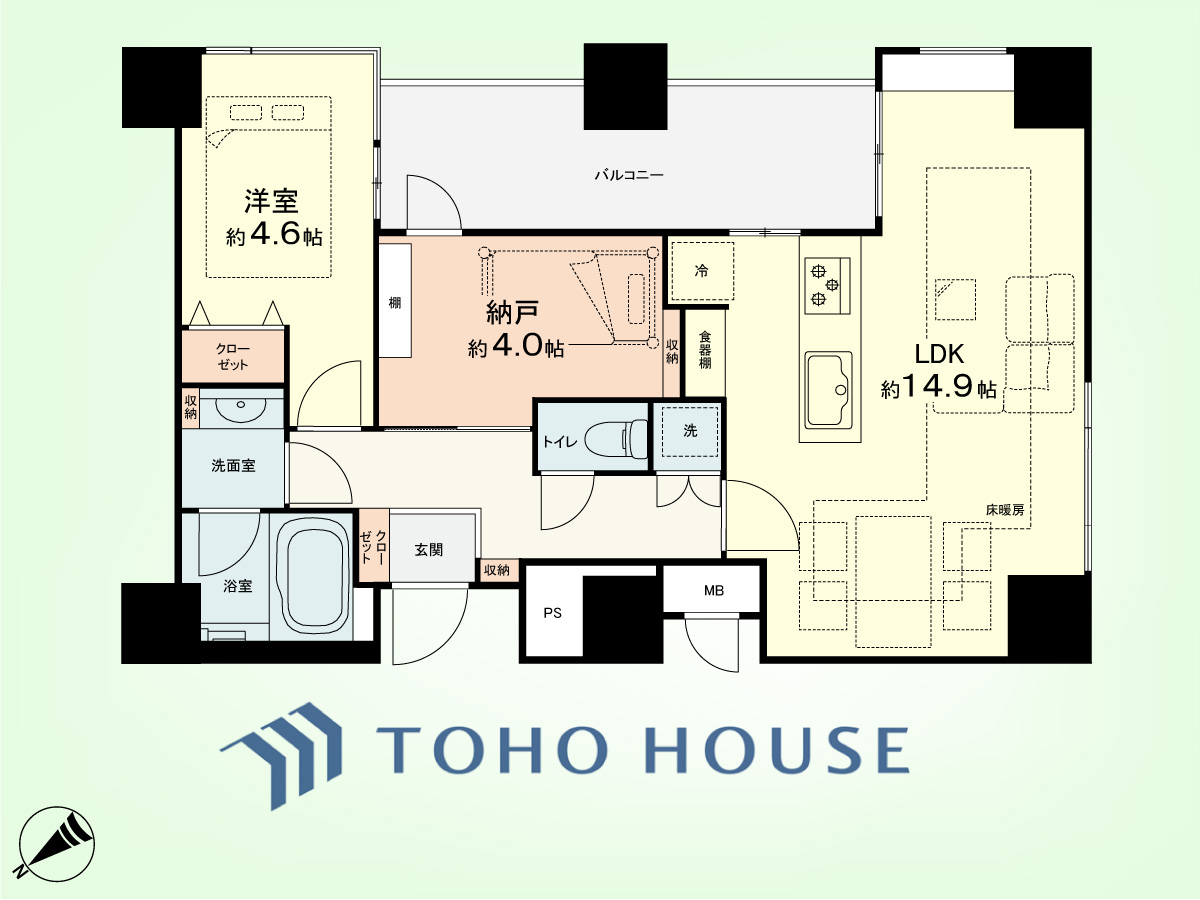 1SLDK 専有面積53.9平米、バルコニー面積8.09平米