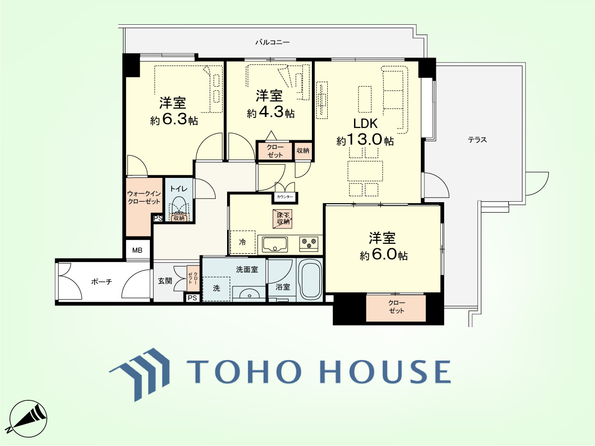3LDK 専有面積68.81平米、バルコニー面積9.3平米、テラス面積16.4平米