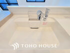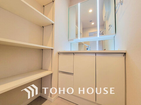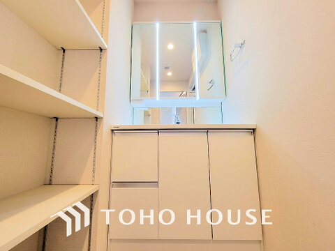 白を基調とした清潔感のある洗面室で朝の身支度を