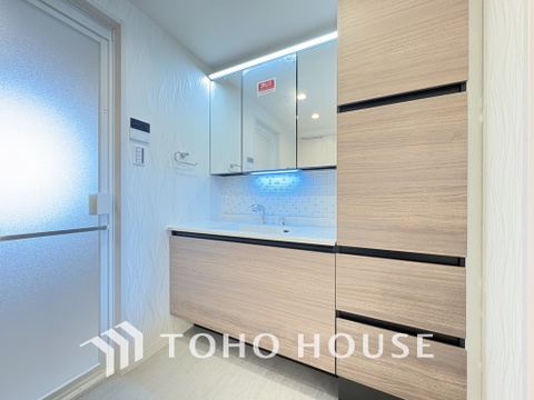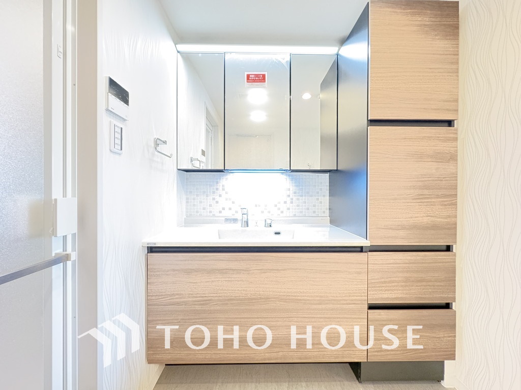 新規設置の洗面化粧台。収納豊富で使い勝手の良い3面鏡です