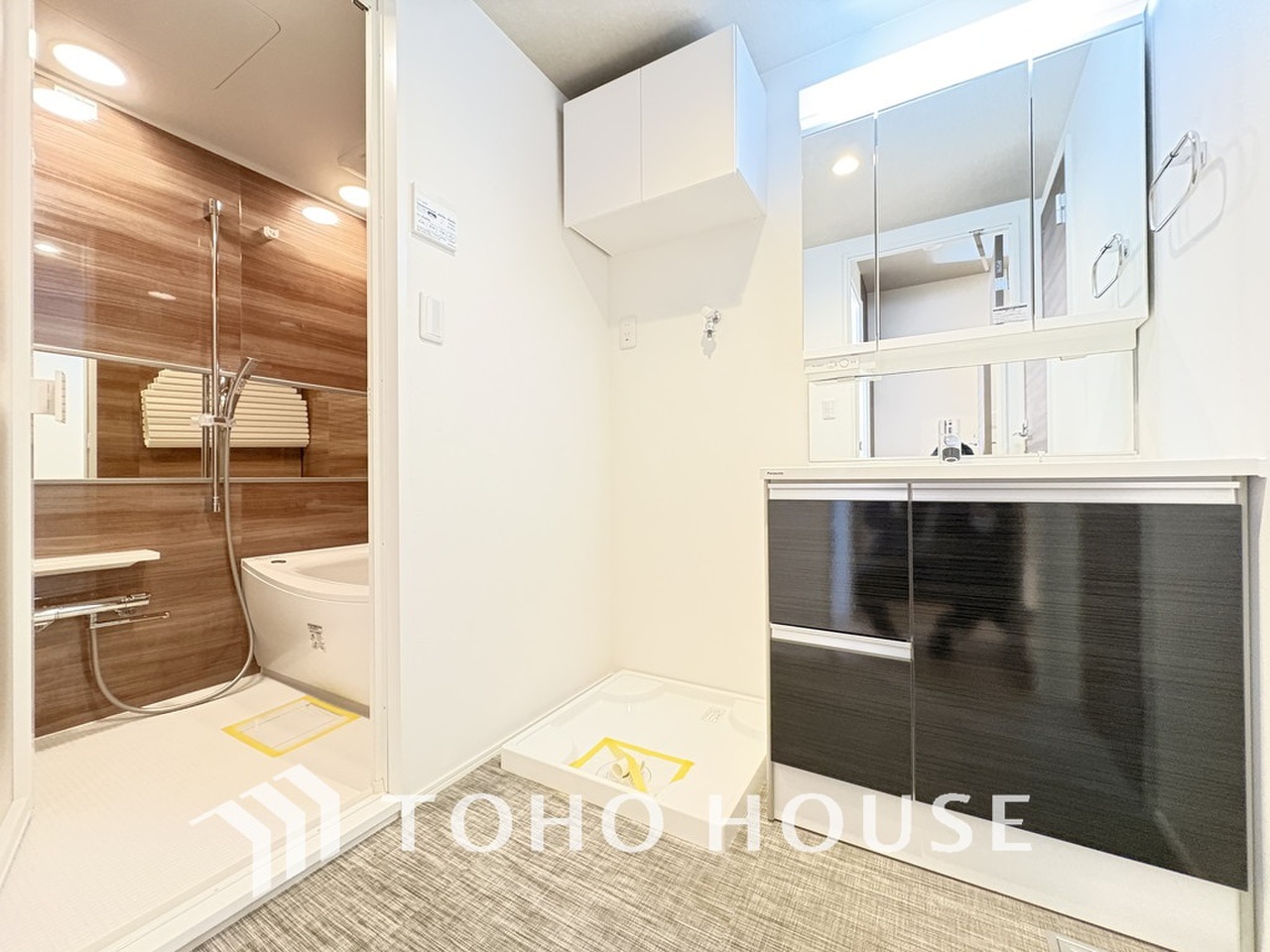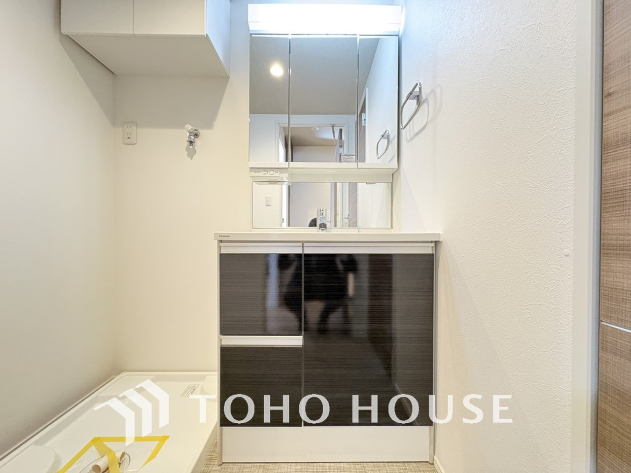 新規設置の洗面化粧台。収納豊富で使い勝手の良い3面鏡です