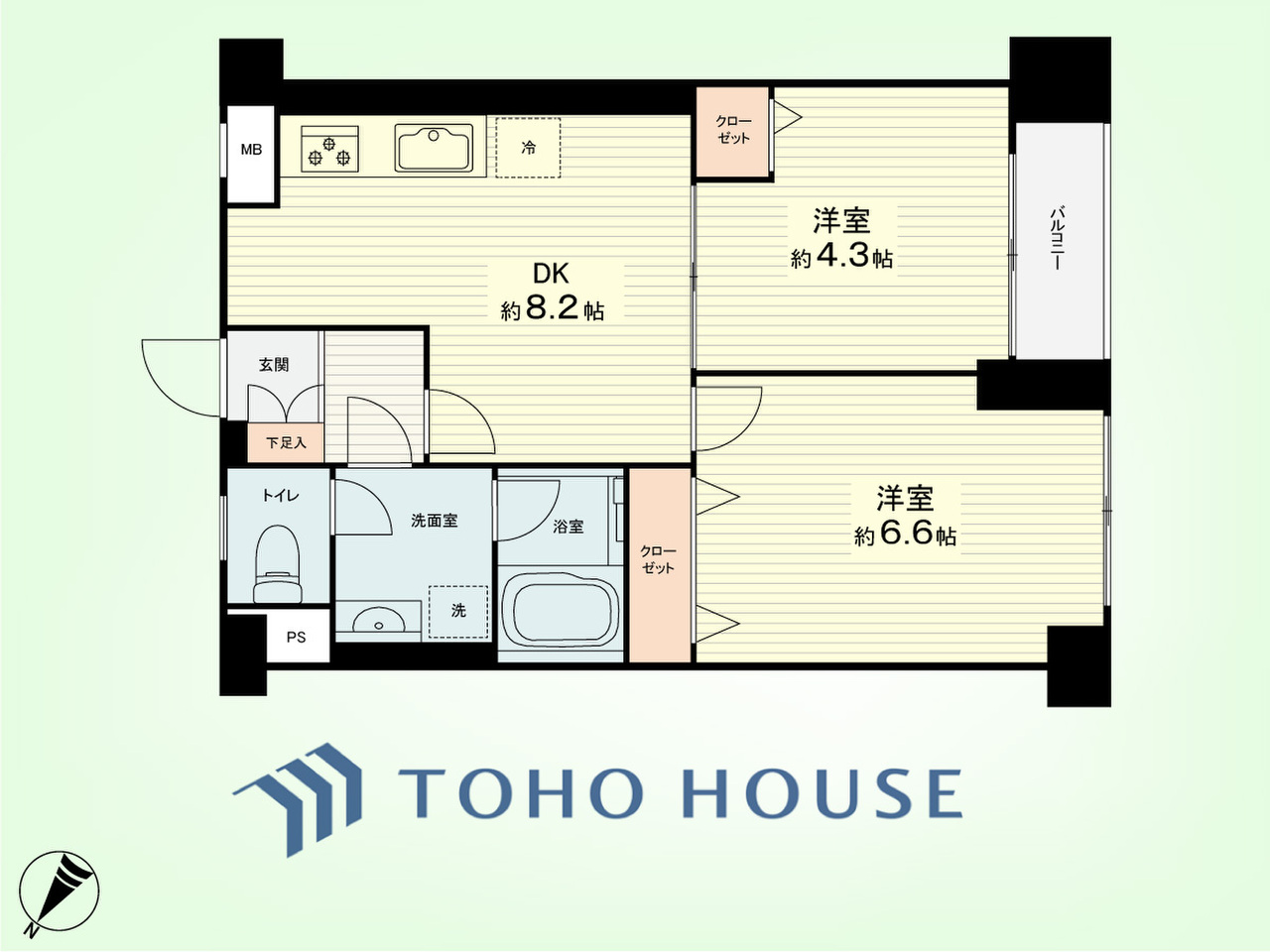 2DK 専有面積42.89平米、バルコニー面積2.70平米