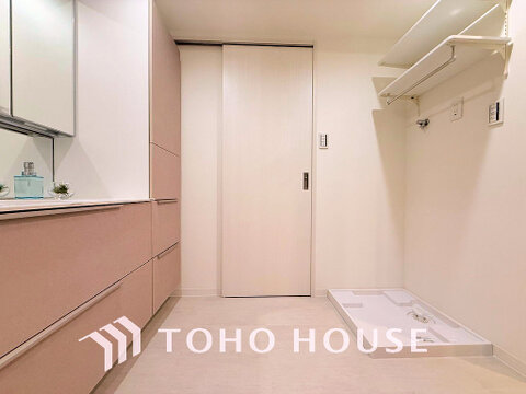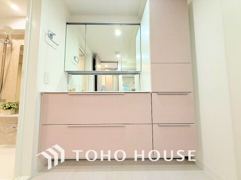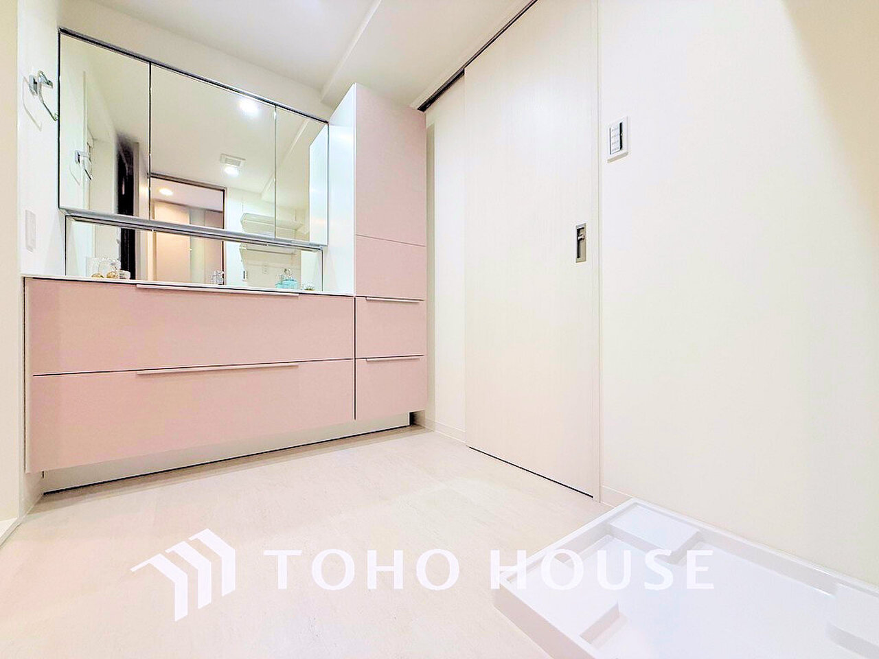 白を基調とした清潔感のある洗面室で朝の身支度を