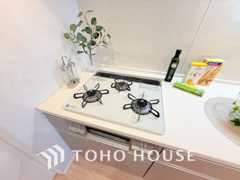 3口ガスコンロでお料理のスピードもUP。効率よくお料理できますね