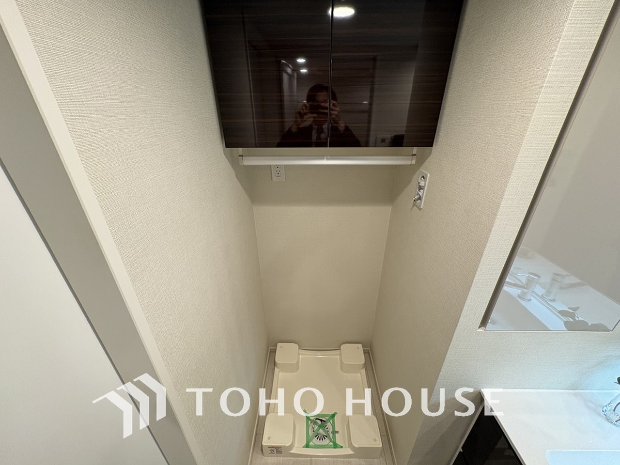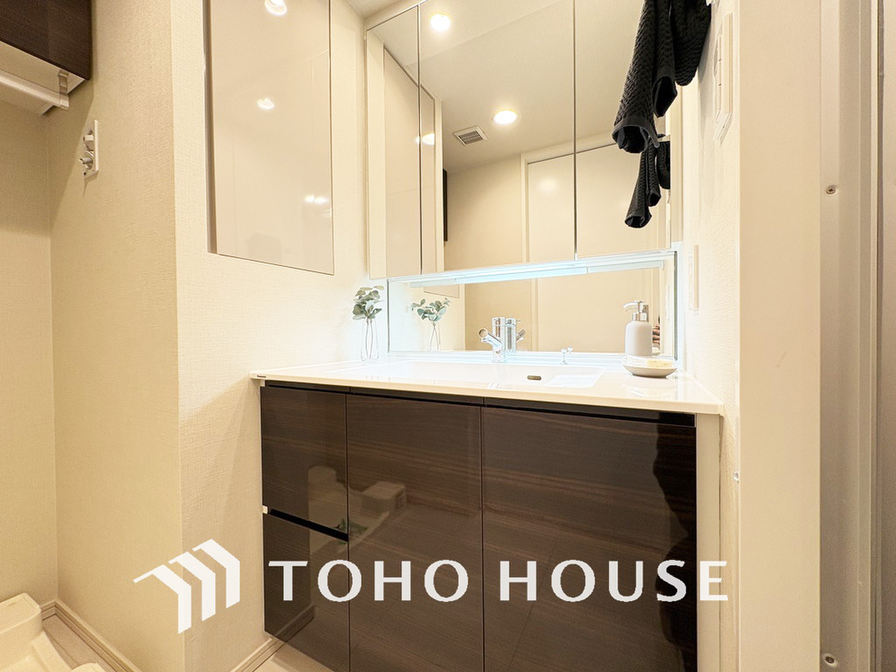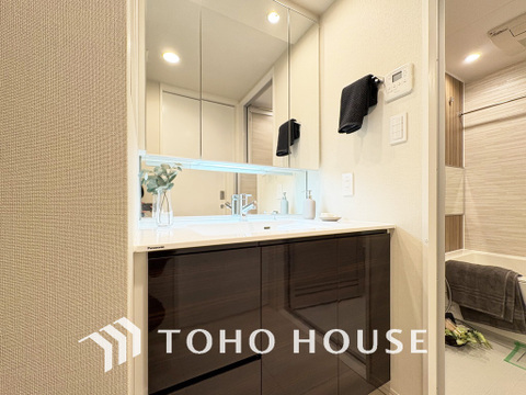 新規設置の洗面化粧台。収納豊富で使い勝手の良い3面鏡です