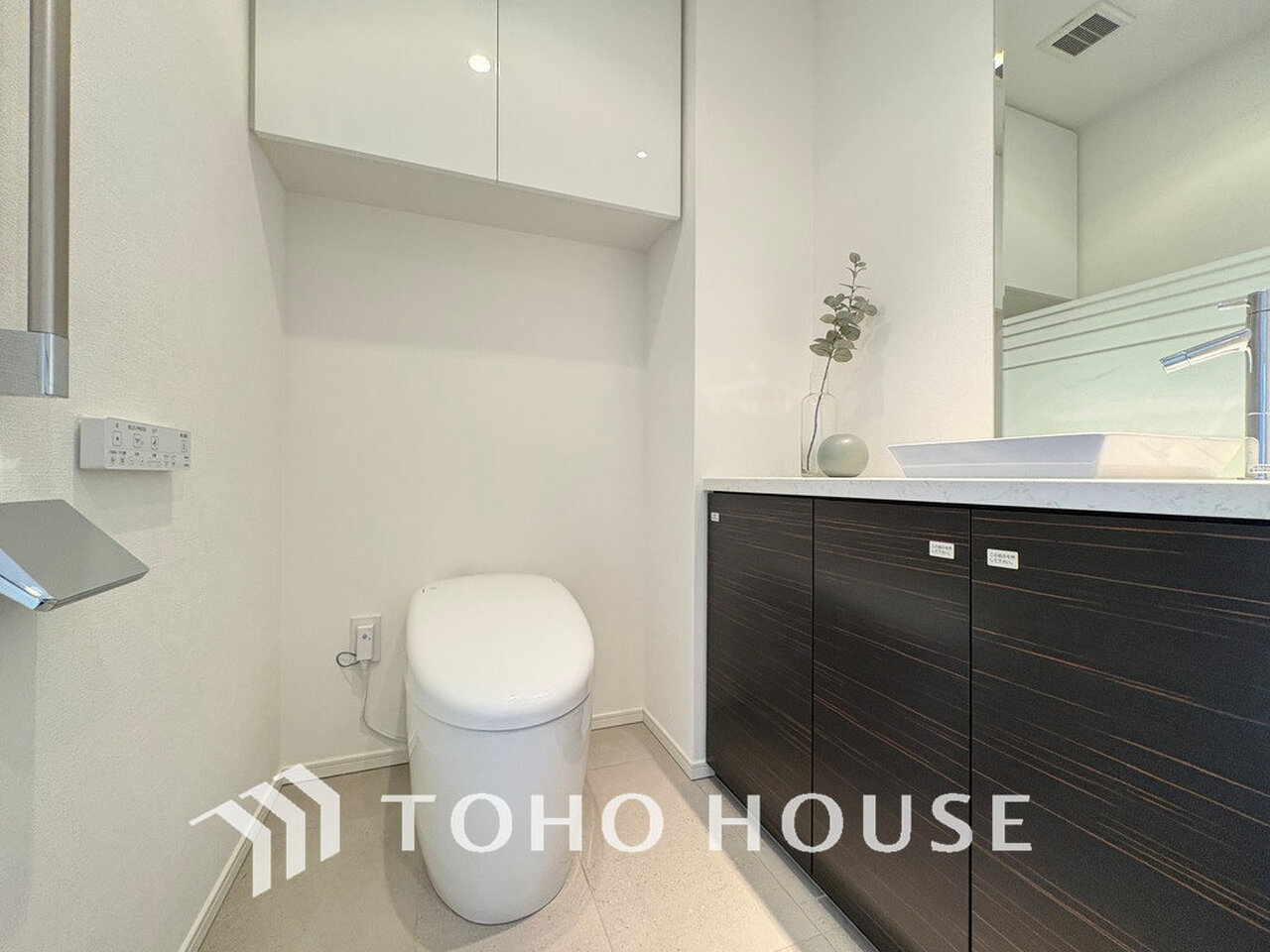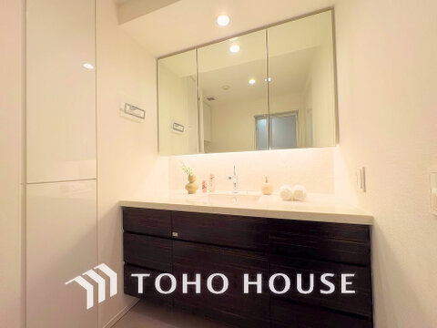 白を基調とした清潔感のある洗面室で朝の身支度を
