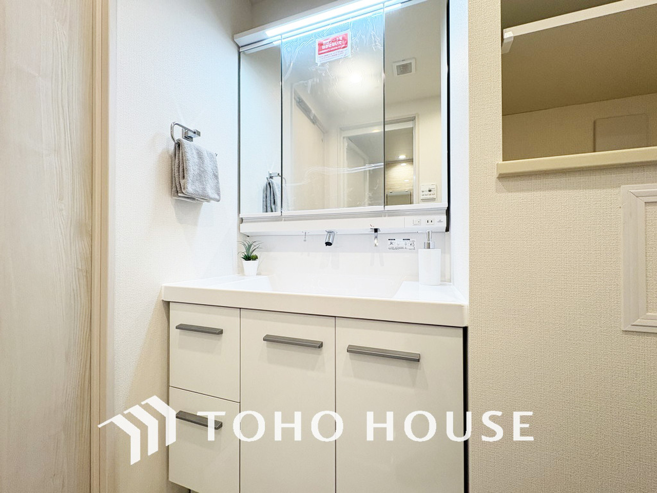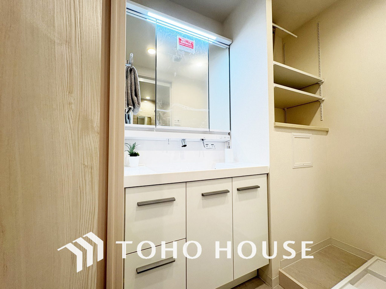新規設置の洗面化粧台。収納豊富で使い勝手の良い3面鏡です