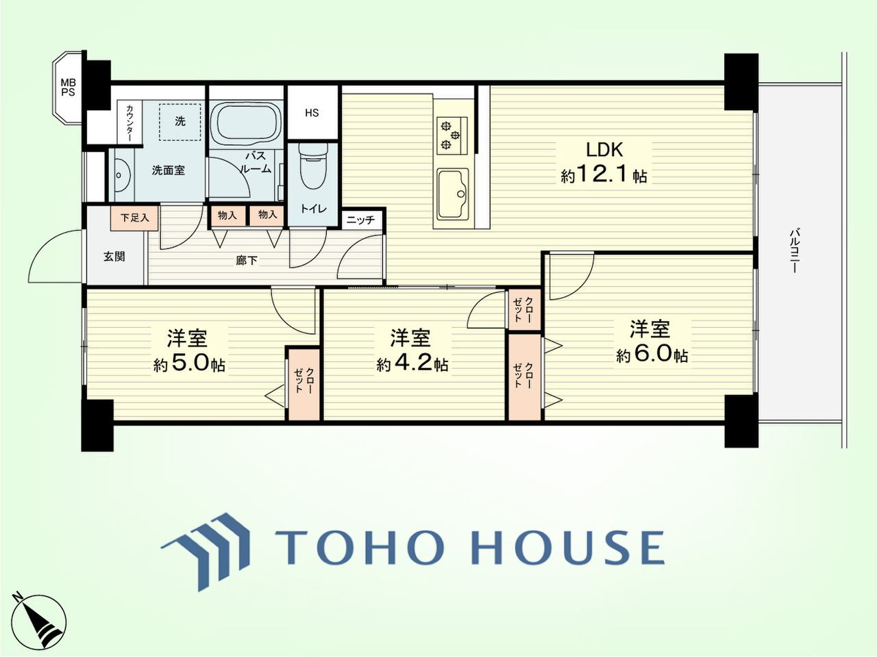 3LDK 専有面積61.60平米、バルコニー面積7.84平米