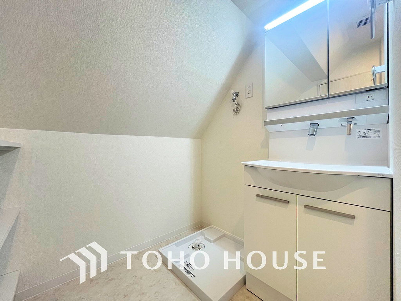 白を基調とした清潔感のある洗面室で朝の身支度を