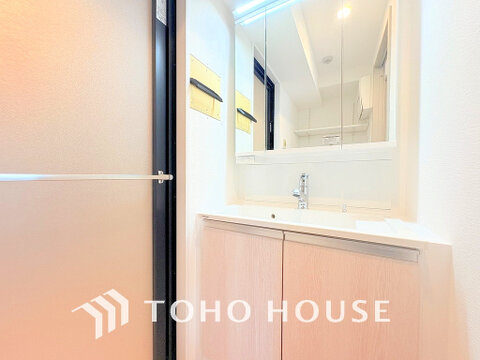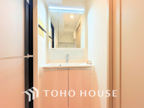 白を基調とした清潔感のある洗面室で朝の身支度を