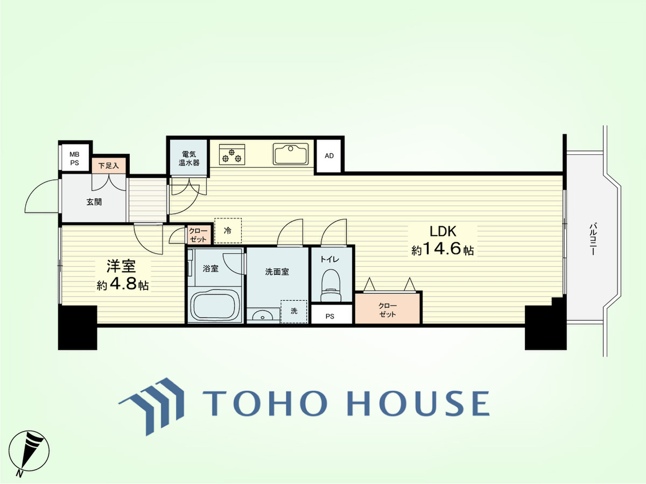 1LDK 専有面積46.74平米、バルコニー面積4.84平米