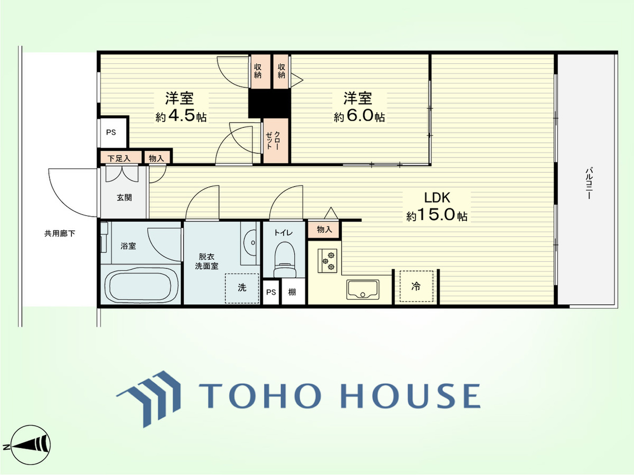 2LDK 専有面積57.44平米、バルコニー面積6.94平米