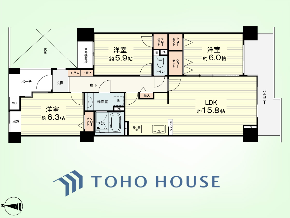 3LDK 専有面積77.04平米、バルコニー面積9.01平米