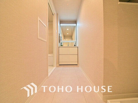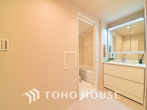 白を基調とした清潔感のある洗面室で朝の身支度を