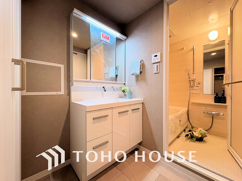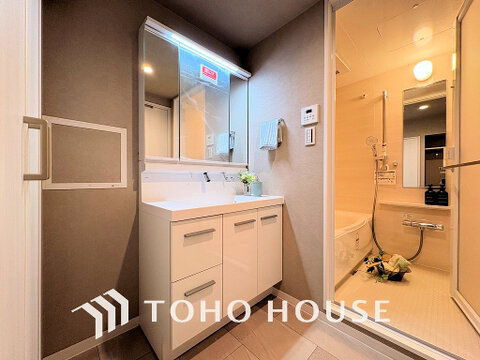 白を基調とした清潔感のある洗面室で朝の身支度を