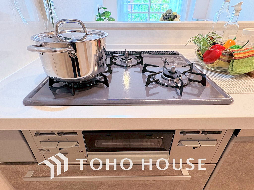 3口ガスコンロでお料理のスピードもUP。効率よくお料理できますね