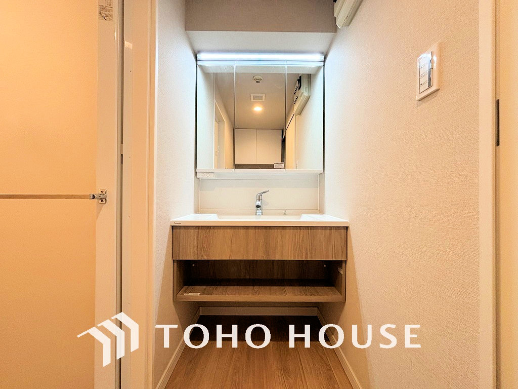 白を基調とした清潔感のある洗面室で朝の身支度を