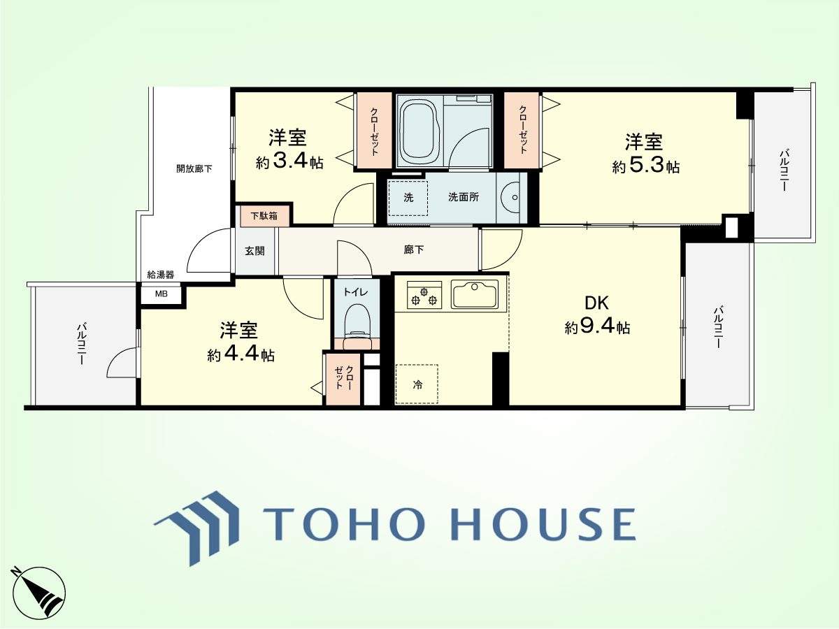 3DK 専有面積52.84平米、バルコニー面積10.61平米