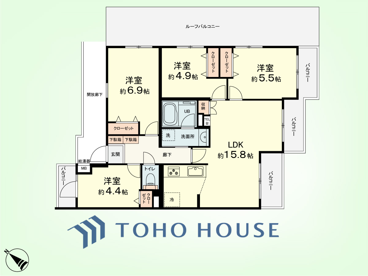 4LDK 専有面積79.57平米、バルコニー面積7.17平米、ルーフバルコニー面積16.49平米