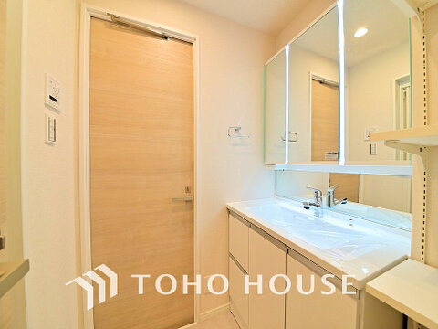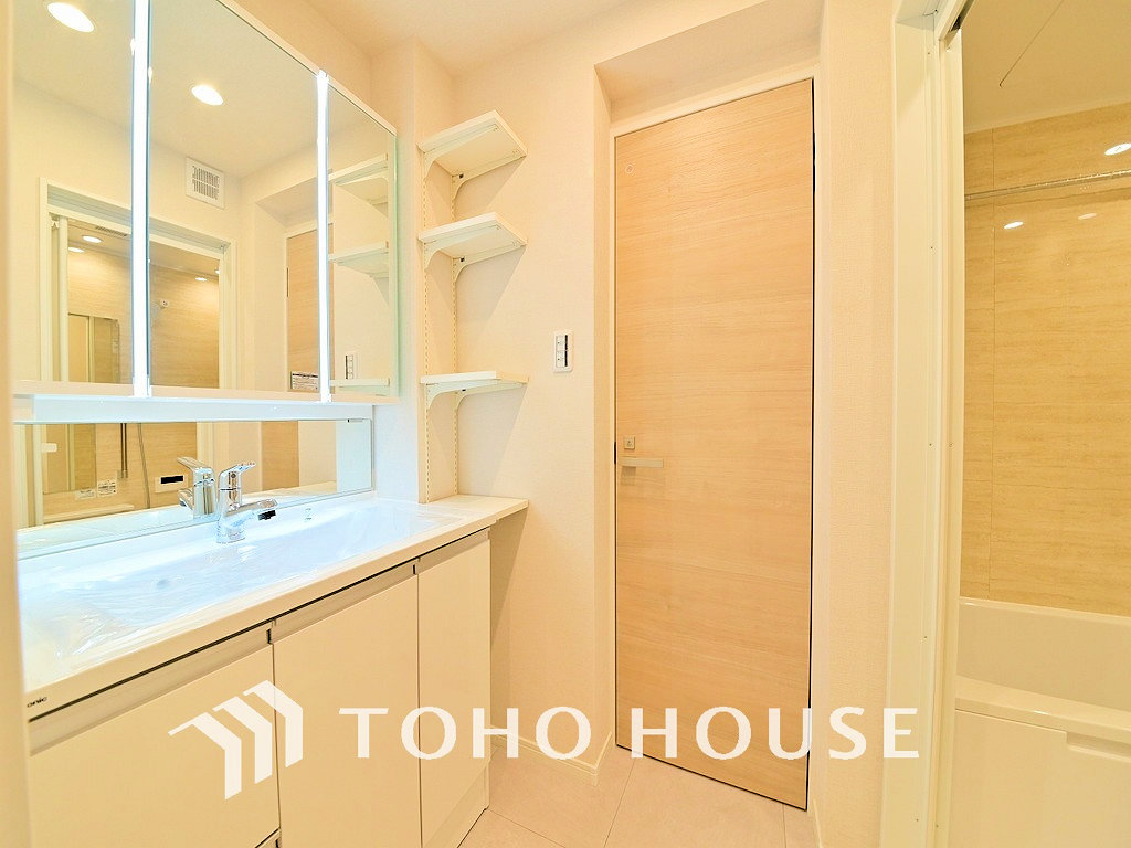 白を基調とした清潔感のある洗面室で朝の身支度を