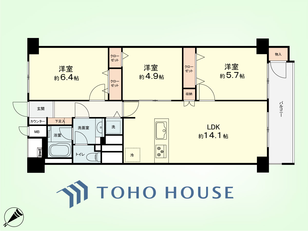 3LDK 専有面積68.66平米、バルコニー面積6平米