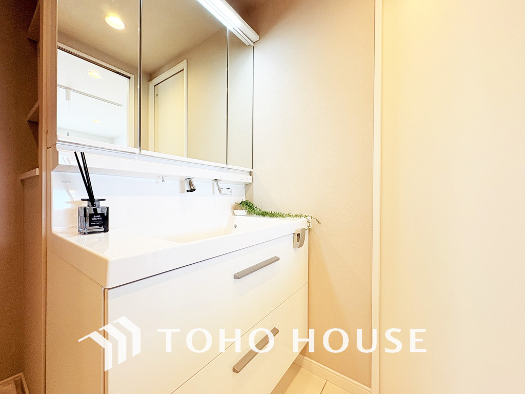 白を基調とした清潔感のある洗面室で朝の身支度を