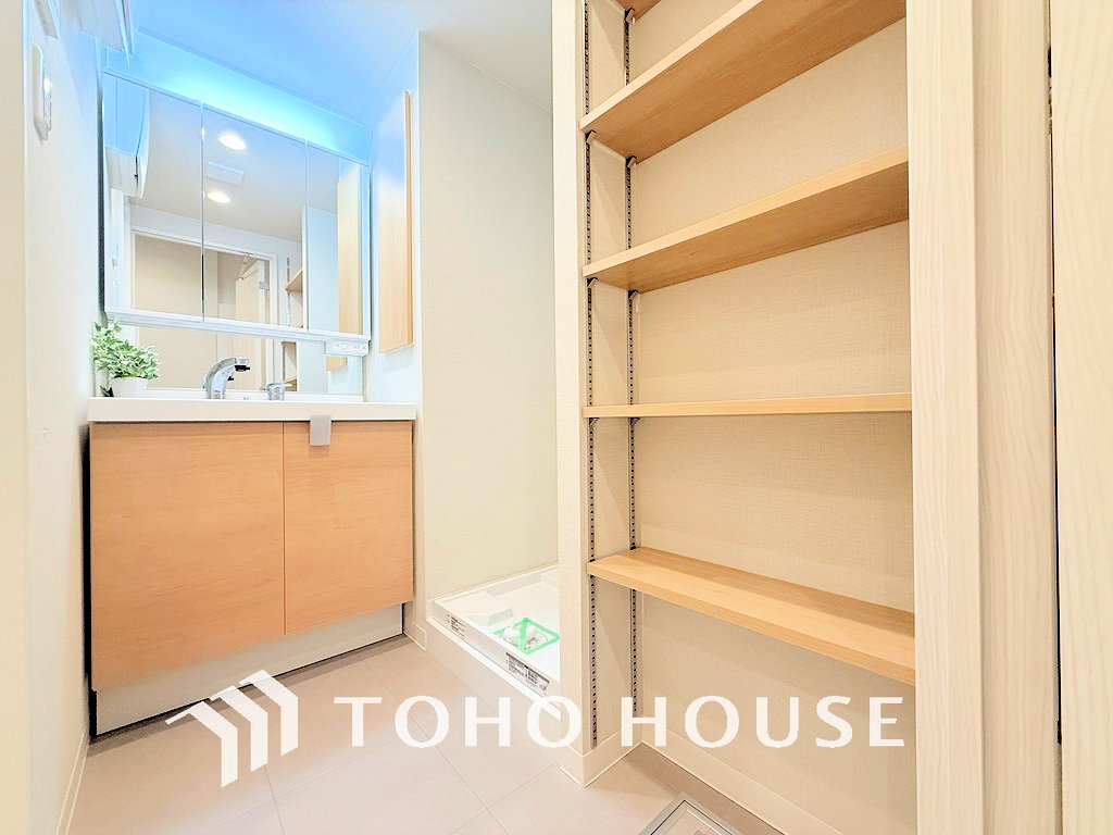 白を基調とした清潔感のある洗面室で朝の身支度を