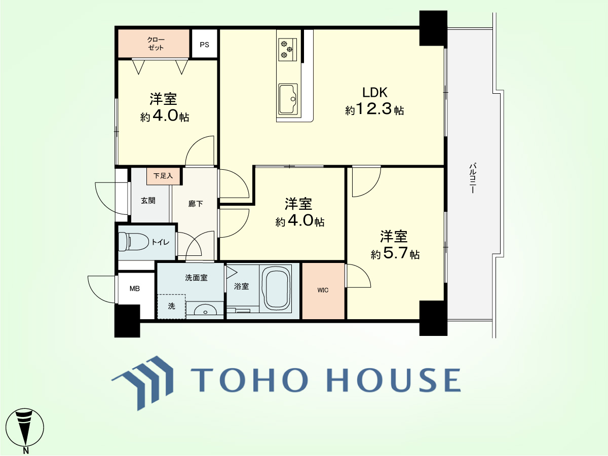 3LDK 専有面積57.87平米、バルコニー面積9.27平米