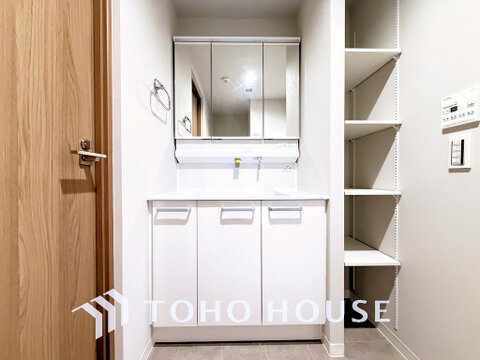 白を基調とした清潔感のある洗面室で朝の身支度を