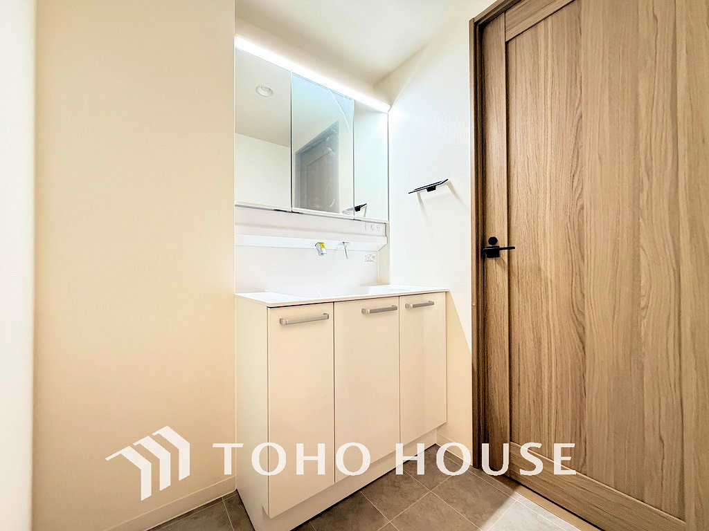 白を基調とした清潔感のある洗面室で朝の身支度を