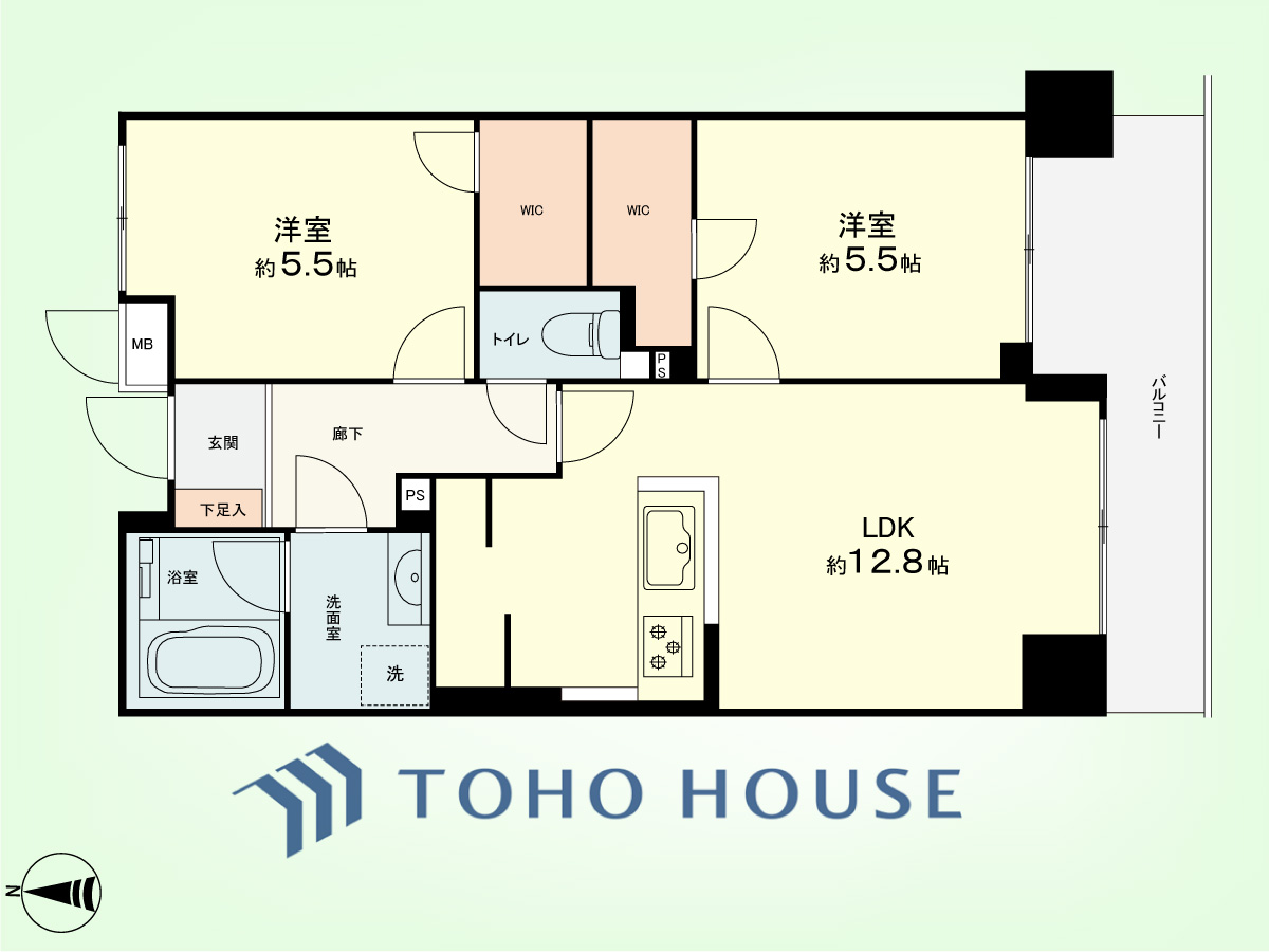 2LDK 専有面積55.55平米、バルコニー面積7.85平米