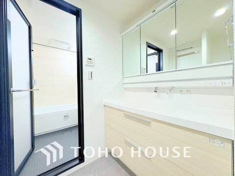 白を基調とした清潔感のある洗面室で朝の身支度を