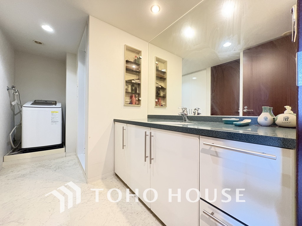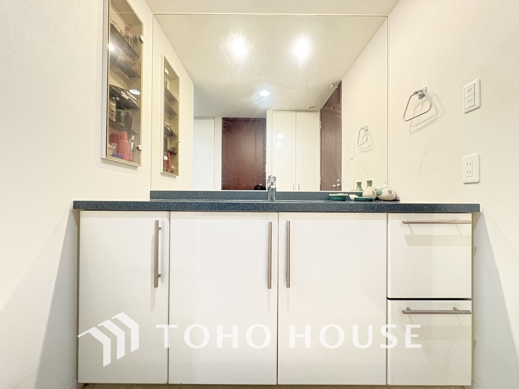 大きな洗面鏡付きの洗面化粧台