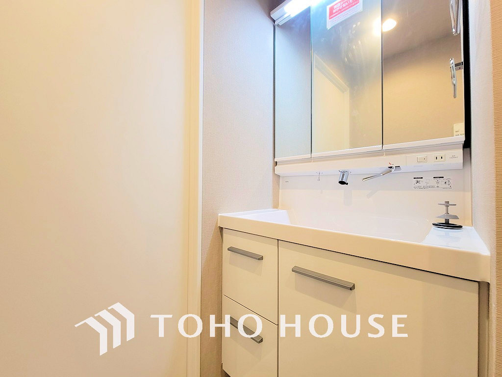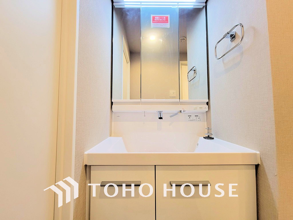 白を基調とした清潔感のある洗面室で朝の身支度を