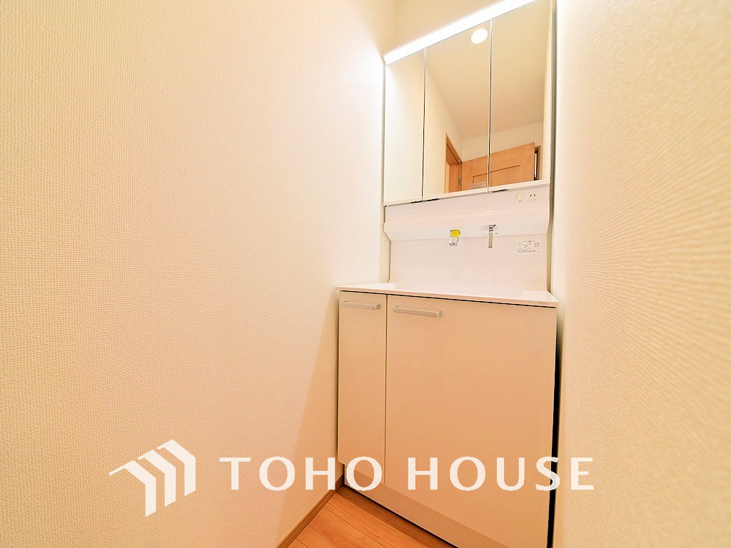洗面台には三面鏡を採用。身だしなみを整えやすく収納量も良好です