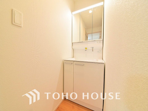 洗面台には三面鏡を採用。身だしなみを整えやすく収納量も良好です