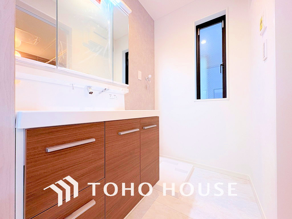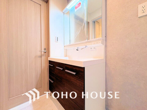 洗面台には三面鏡を採用。身だしなみを整えやすく収納量も良好です