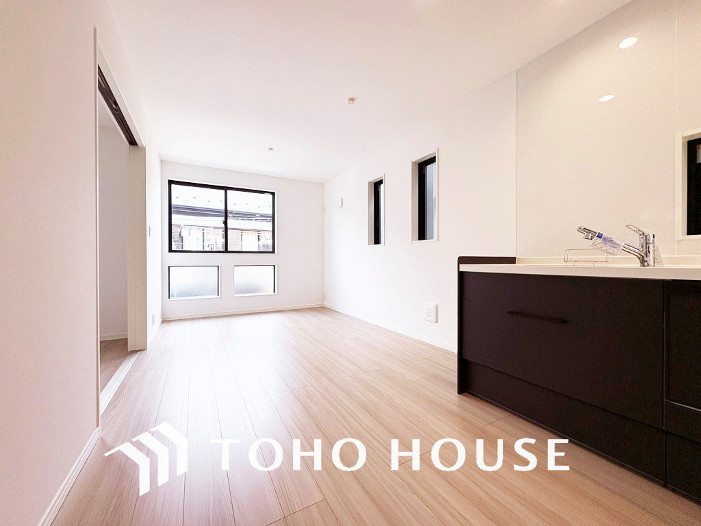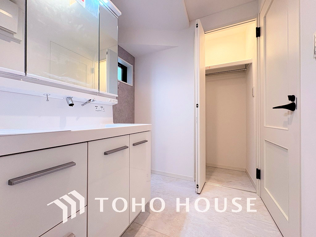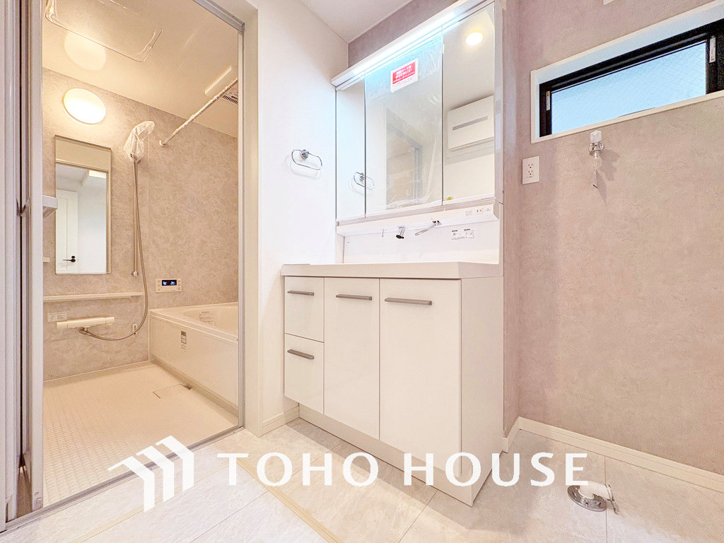 洗面台には三面鏡を採用。身だしなみを整えやすく収納量も良好です