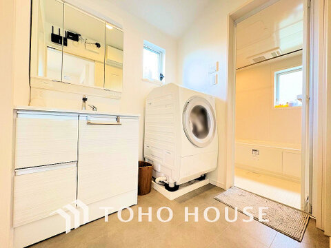 洗面台には三面鏡を採用。身だしなみを整えやすく収納量も良好です